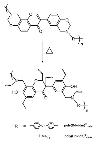 The following method was used to prepare polybenzoxazine samples. The main-chain-type benzoxazines were dissolved in DMF to form 30% solid content solutions. Afterward, the solutions were transferred into a stainless steel mould. In order to remove the solvent in the samples, the samples were treated in an air-circulating oven at 120 °C for two days. Both main-chain types of benzoxazines, poly(Dd-ddm)main and poly(Dd-hda)main, were then polymerized at 160, 180, 200, 220, 240, and 260 °C for 2 h each to obtain cross-linked poly(Dd-ddm)Xmain and poly(Dd-hda)Xmain, respectively.