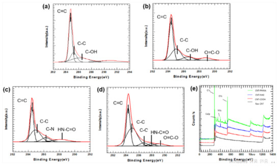 X-ray photoelectron spectroscopy (XPS) spectra of MWCNTs: (a) pristine MWCNT, (b) MWCNT–COOH, (c) MWCNT–NH2, and (d) PMMA–g–MWCNT; (e) wide scan spectra.