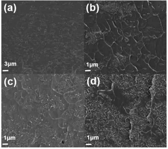 The SEM cross-section images of the PMMA/PS(50/50) blends. (a,b) PS phase-etched blend PMMA/PS(50/50) and (c,d) PMMA/PS(50/50) without etching.