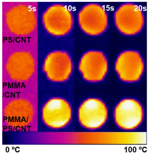 Figure 11 shows some photos of IR camera. Color goes brighter with temperature. IR pictures of PS/MWCNT, PMMA/MWCNT, and PS/PMMA/MWCNT (10/90/3wt%) are arranged in a row from left to right. All samples contain 3wt% of MWCNTs. Color of samples goes bright as temperature goes up. In Figure 10, sample on right one has the brightest color of three samples. These color changes revealed the effect of phase separation using two polymers.