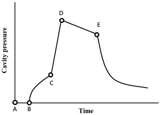Injection molding is a cyclic process consisting of four stages: filling, compressing, packing, and cooling/plasticizing. The cavity pressure has been proven to determine the repeatability of injection molding quality [2]. Figure 1 shows a typical cavity pressure curve in which the filling process begins at point A and then the cavity pressure signal begin at point B, where the molten resin initially contacts the pressure sensor, and then the pressure increases steadily as the filling progresses. The filling phase is completed at point C, where the cavity is volumetrically filled with molten resin without being compressed. The compression process then begins and the pressure quickly rises to the peak of point D. Thus, during the packing phase, as additional molten resin enters the cavity to compensate for shrinkage of the plastic, the melt within the cavity remains at the specified pressure. This process continues until the point at which the gate is sealed, as indicated by point E. The final cooling phase occurs after this and continues until the end of the cycle. During this phase, as the coolant circulating in the cooling channels in the mold removes heat, the molten resin gradually solidifies, with the rate of cooling and solidification determining the rate of decline of the cavity pressure.