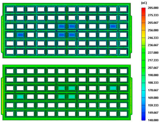 Temperature distribution of IC trays corresponding to different cooling channel designs: initial design (top) and improved design (bottom).