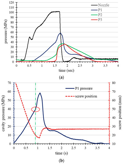 Cavity pressure profile and screw position with over-filling (no packing): (a) pressure profiles as the screw stroke acts on the fully filled cavity without packing; (b) the screw position of the completely filled cavity can be identified as about 17 mm.