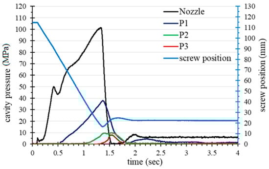 In this study, a nozzle pressure sensor and three cavity pressure sensors (SSB01KN08 × 06, Futaba Co., Chiba, Japan) were used to detect changes in polymer melt pressure during injection molding. The pressure curves detected by the sensor are further used to achieve the following four objectives: (1) formulate rules for determining the V/P switching time, (2) establish gate frozen time rules, (3) pass pvT’s packing pressure adjustment to improve part shrinkage, (4) achieve a robust molding pressure profile that can be used as a standard profile for molds operating in different machines as well as quality monitoring in mass production.