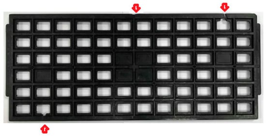 This study developed a single screw position identification technique in which a cavity pressure profile is used to determine the screw position of a fully filled cavity. Table 2 shows the injection molding operating parameters and Figure 6a shows the pressure profile as the screw stroke acts on the fully filled cavity without packing. The pressure profiles show that when the cavity is completely filled, the behavior of the molten resin changes from flow to compression, which causes a sudden rise in cavity pressures (P1, P2, and P3). The point on the sudden raised pressure profile indicates the time at which the cavity is completely filled. Therefore, the screw position of the completely filled cavity can be identified as about 17 mm (see Figure 6b). The study showed that the appropriate switching time was set to about 95% volume filling (in this case about 17 mm in the screw position) to prevent over-packing. Moreover, Figure 7 shows cavity pressure profiles for changing the V/P switching, where the position is set to 95% of the unpacked screw stroke, and Figure 8 shows the corresponding part with short shot. It has been shown that when the cavity is not completely filled, the pressure profile does not have a rapidly increasing value.