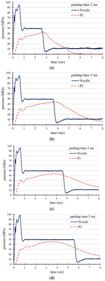 Pressure profiles w.r.t. various packing time: (a) 2 s, (b) 3 s, (c) 4 s, and (d) 5 s.