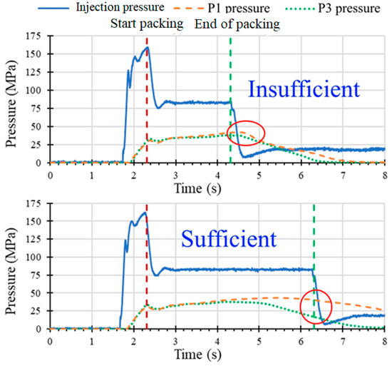 For an insufficient packing time setting, the gate does not freeze, causing a portion of the molten resin to flow out of the cavity, thus causing a sharp drop in the cavity pressure profile immediately after the release of the packing pressure. Conversely, sufficient packing time maintains a relatively smooth reduction in the cavity pressure curvature.