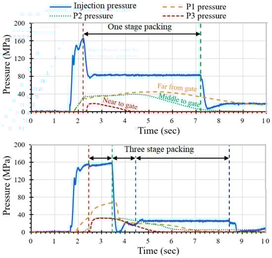The pressure profile relative to: one-stage packing (warpage: 0.60 mm) (top); three-stage packing (warpage: 0.42 mm) (bottom).