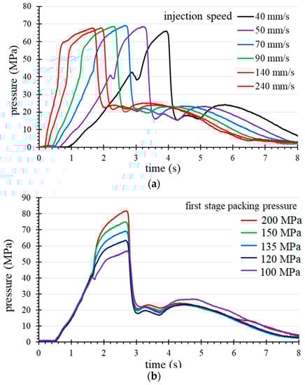 The P1 pressure variation with (a) injection speed (first stage packing pressure 135 MPa) and (b) first stage packing pressure (injection speed 70 mm/s).