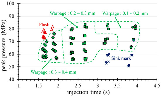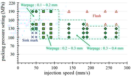 As for the goal of obtaining a robust molding profile [21], Figure 13 and Figure 14 show a comparison of the quality profiles with the machine set point (machine-centric) and quality index (plastic perspective) extracted from the process parameters. Figure 13 shows that the optimum setting for robust operation is at a packing pressure setting of 135 MPa and an injection speed of 70 mm/s. In comparison with Figure 13, the optimum parameters in Figure 14 for the first stage packing is a peak pressure of 70 MPa and an injection time of 2.8 s. These two numbers represent information about the process of obtaining robust parameters, but are completely different. Figure 13 shows a narrow process window for obtaining the minimum warpage (0.1 to 0.2 mm) of the IC tray corresponding to the set values of the packing pressure and the injection speed. Therefore, the ideal injection speed needs to be fine-tuned and can be easily omitted in a machine-centric situation. In contrast, the quality indicator domain in the plastic perspective shown in Figure 14 is more advantageous because it reveals its strict relationship to warpage, which can be used not only for quality monitoring, but also as a reference for quality control. In addition, the robustness parameter setting indicated by the quality indictor domain is independent of the operating injection molding machines in continuous production after molding test. This advantage facilitates fast and consistent quality manufacturing in injection molding plants.