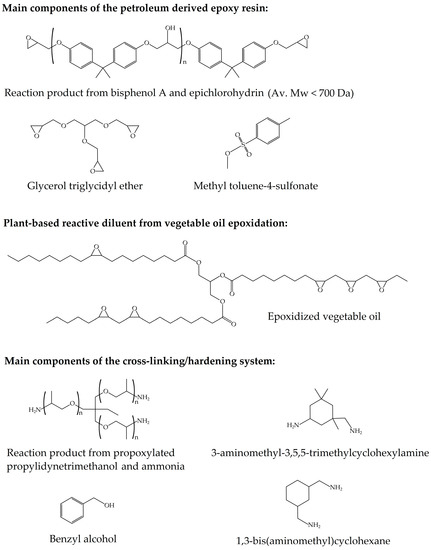 - Czub, P. Application of modified natural oils as reactive diluents for epoxy resins. Macromol. Symp. 2006, 242, 60–64. [Google Scholar] [CrossRef]