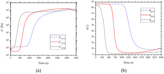 Evolution of (a) storage modulus (G′) and (b) phase angle ( with time of the partially bio-based epoxy resins subjected to standard curing (SC) treatment, obtained by rheometry.