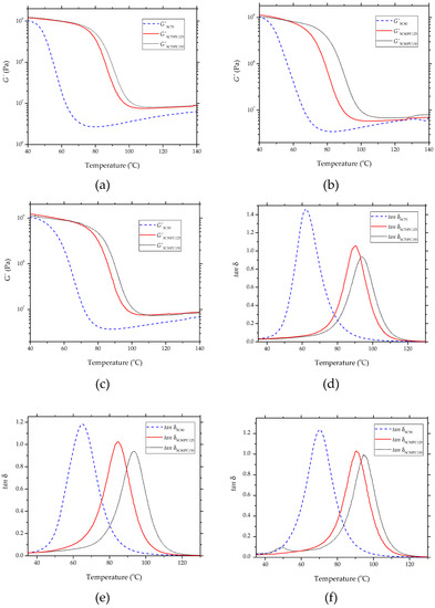 Figure 5 shows the thermomechanical behavior of the bio-based epoxy resins after the different curing and post-curing treatments. Table 5 summarizes the values of G′ at 40 and 110 and also of Tg, obtained from the DMTA curves. Figure 5a–c depict the evolution of G′ with temperature for the samples that were subjected to curing at 70 , 80 90 and post-curing at 125 and 150 . At 40 , the values of G′ were 1.029 ± 0.021 GPa, 1.039 ± 0.025 GPa, and 1.037 ± 0.024 GPa for the resins cured at 70 , 80 and 90 respectively. As the temperature increased, a sharp drop in the G′ values of two orders of magnitude was observed, indicating that the partially bio-based epoxy resins underwent glass transition. At a higher temperature, that is, 110 , the samples showed similar G′ values, that is, 4.29 ± 0.09 MPa, 4.99 ± 0.15 MPa, and 4.68 ± 0.09 MPa, for each respective curing temperature. It is also worthy to mention that higher G′ values were attained with the curing temperature increase. This result can be explained by the fact that the increase in the cross-linking density results in a material’s stiffness [47].