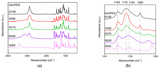 Fourier transform infrared (FTIR) of Azo/PEG complexes at wavenumbers of (a) 4000–400 cm−1 and (b) 1200–1000 cm−1. The complex compositions are designated in wt %.