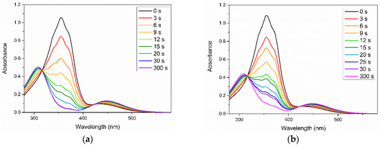 Variations in the UV–Vis spectra of (a) neat Azo and (b) 50:50 Azo/PEG complex dissolved in benzene during UV irradiation. The complex compositions are designated in wt %.