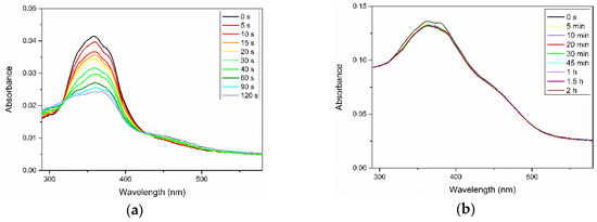 The most intriguing characteristics of azobenzene molecules is their photoinduced response after UV irradiation. Figure 3 presents the variations of the UV–Vis spectra of the Azo and 50:50 Azo/PEG complex in benzene upon UV irradiation. Initially, maximum absorbance was observed at a wavelength of approximately 360 nm for both samples regardless of the addition of PEG. This absorbance was associated with the π–π* absorption of trans isomers. When the Azo and Azo/PEG complex were exposed to UV light, the absorbance at a wavelength of 360 nm decreased considerably. Simultaneously, we observed an increase in the absorbance at a wavelength of approximately 450 nm, which corresponded to the n–π* absorption of cis isomers. Although the entire curve of the UV spectra changed with isomerization, two absorbance values at wavelengths of approximately 320 and 425 nm remained constant. The presence of these two isosbestic points indicated that the two distinct absorbing species equilibrated with each other and that no side reaction occurred during photoisomerization [44]. Furthermore, the π–π* absorption of trans isomers decreased consistently as UV exposure time increased until a photostationary state was achieved. Varying solvents did not influence the photoresponsive characteristic of the Azo and Azo/PEG complexes but changed the time required to reach the photostationary state. The first-order kinetics were assumed in research to describe the kinetics of the trans-to-cis photoisomerization of azobenzene mesogens, as given by [45]: