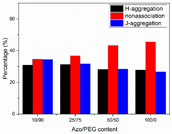 We deconvoluted the UV spectra of Azo/PEG complexes in thin films according to the wavelengths of H-aggregated, nonassociated, and J-aggregated mesogens at 334, 360, and 384 nm, respectively. The area of each deconvoluted peak divided by the total area of the absorbance gives the proportion of the different aggregation states for azobenzenes, the results are presented in Figure 5. In the neat Azo, nonassociated mesogens dominated. When Azo formed complexes with PEG, the proportion of nonassociated mesogens decreased monotonically, whereas the proportions of J-aggregated and H-aggregated mesogens increased with increasing PEG content. Such behavior indicated that the confined domains generated by the self-assembly of Azo and PEG facilitated the organization of azobenzene molecules. Studies have suggested that when azobenzene molecules are confined, such as in azobenzene-containing homopolymers, in microphase-separated domains of block copolymers, or in the core of micelles, mesogens tend to assemble into H-aggregation [23,25,26,46]. Although the self-assembly of azobenzene molecules and PEG through hydrogen bonds was unable to form compact microdomains to heavily turn nonassociated mesogens into aggregated mesogens, as micelles and block copolymers do, the formation of Azo/PEG complexes could nonetheless facilitate the aggregation of mesogens. This finding suggested that intermolecular interaction enables manipulation of the azobenzene molecules′ aggregation state.