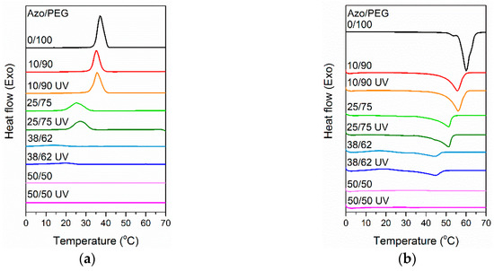 To understand the effect of photoisomerization on the crystallization behavior of Azo/PEG complexes, UV-exposed and non-UV-exposed Azo/PEG complexes were characterized using DSC. Figure 6a compares the heat flow of Azo/PEG complexes with and without UV exposure during cooling. Table 2 summarizes the crystallization temperature of the complexes extracted from the DSC curves. Generally, the blend system with the presence of hydrogen bonds exhibits a lower critical solution temperature behavior. High temperatures weaken hydrogen-bonding interaction, leading to the phase separation of the blend. However, hydrogen-bonded hydroxyl groups and ether groups normally dissociate at temperatures much higher than 100 °C [42,47]. Therefore, the experimental conditions used in this study would not cause the dissociation of PEG and Azo.
