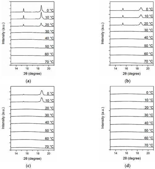 As discussed in preceding sections, the aggregation states of complexes containing azobenzene strongly depended on the structure of the complexes. The aggregation state of mesogens further determined the photoresponsive behavior of complexes. However, the specific crystal morphology and crystallization behavior of PEG could influence the final properties of the complexes, such as optical properties and adhesion. Therefore, we examined structural changes in Azo/PEG complexes using simultaneous SAXS and WAXS. Figure 8 presents the WAXS patterns of neat PEG and its complexes with Azo during cooling. For the neat PEG (Figure 8a), when the temperature exceeded 30 °C, only an amorphous halo was observed. When the temperature decreased to lower than 30 °C, two diffraction peaks at 2θ of 15.4° and 18.5° developed and were assigned as the (120) and (112/004) crystalline planes, respectively [48]. The addition of Azo did not alter the crystal structure of PEG. However, the onset crystallization temperature gradually decreased as the Azo content increased, indicating that the addition of Azo resulted in a decrease in the nucleation rate of PEG. This is consistent with the DSC results. Furthermore, adding Azo to PEG reduced the peak intensity and increased the peak width, indicating that the crystal structure of PEG tended to be more imperfect in the complexes. When the Azo/PEG content was 50:50 (Figure 8d), all the diffraction peaks disappeared, suggesting that no crystallization occurred.