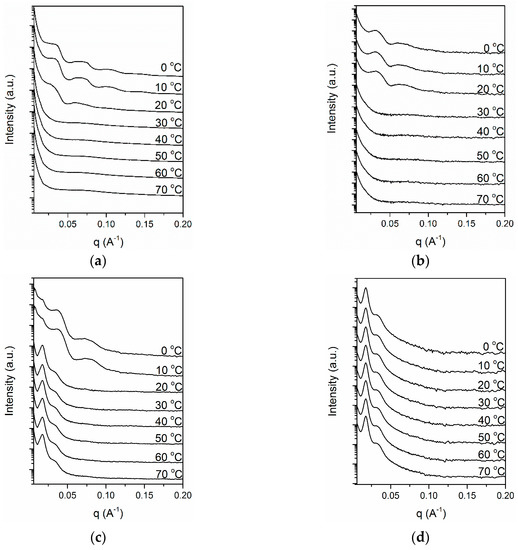 Figure 9 depicts the series of SAXS patterns of the neat PEG and its complexes with Azo during cooling. The SAXS pattern of the neat PEG, as portrayed in Figure 9a, exhibited multiple peaks at q values of 0.035, 0.070 and 0.106 Å−1, which resulted from the crystalline-amorphous structure of PEG crystals. The broad feature of these peaks was caused by the nonuniform thickness of chain-folded lamellae. The long period of the crystal lamellar structure, calculated using Bragg’s law, was 18.0 nm. The peaks began to appear at 20 °C, which is consistent with the onset crystallization temperature obtained in WAXS, confirming that the peaks in the SAXS pattern originated from PEG crystallization. Similar crystallization behavior was observed when the Azo/PEG content was 10:90 (Figure 9b). When the Azo content was increased to 25% (Figure 9c), two sharp peaks were observed at q values of 0.017 and 0.034 Å−1 at 70 °C. At this temperature, PEG was amorphous, therefore, the two peaks were not caused by PEG crystallization. We attributed these peaks to the microphase separation of PEG and Azo. The peaks exhibited the q ratio of 1:2, indicating that PEG and Azo microphase separated to a lamellar morphology. During cooling, the morphology of the Azo/PEG complex was retained and the domain size remained constant. When the temperature reached 10 °C, PEG crystallization occurred, confirmed by the development of two broad peaks located at q values of 0.037 and 0.074 Å−1. Although the intensity of the diffraction peaks originating from the microphase separation of Azo and PEG was overwhelmed by the intensity of the diffraction peaks contributed by PEG crystallization, the presence of a small peak at the q value of 0.017 Å−1 suggested that Azo and PEG still exhibited microphase separation. These results indicated that two types of structures with different length scales, including microphase separation of Azo and PEG and PEG crystallization, coexisted in the system. We further increased the Azo content to 50% (Figure 9d). The two peaks representing the microphase separation of Azo and PEG were observed for the entire temperature range of the measurement. Using the one-dimensional correlation function [49], we obtained the average long period of 34.7 nm, which was identical to the interlamellar distance obtained from the first-order peak position of the SAXS profile. The mean thicknesses of the Azo-rich and PEG-rich microphases were 11.5 and 23.2 nm, respectively. Furthermore, the peaks that were related to PEG crystallization did not appear in the 50:50 Azo/PEG complex, which is consistent with the DSC and WAXS results that indicated PEG crystallization was suppressed by the addition of Azo. These results suggested that microphase separation occurred only when the Azo content was sufficiently high. Additionally, microphase separation was not induced by PEG crystallization.