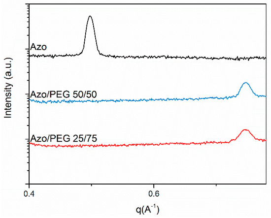 The SAXS patterns in the small q regions present the long-range order associated with PEG crystallization and microphase separation of PEG and Azo. The arrangement of azobenzene mesogens is considered to be at the smaller length scale, which was beyond the q range measured, as depicted in Figure 8. Therefore, we conducted the SAXS measurements of Azo/PEG complexes at q values of 0.40–0.85 Å−1, as seen in Figure 10. The SAXS pattern of the neat Azo exhibited a single peak at the q value of 0.498 Å−1, which resulted from the periodic ordering of mesogens. The lack of higher order peaks indicated that mesogens formed only short-range orders. The long period calculated by Bragg’s law was approximately 12.6 Å. This value was slightly smaller the trans-azobenzene length of approximately 15.0 Å [50], indicating the formation of tilted monosmectic layers of mesogens with a tilt angle to the layer normal. The tilt angle can be calculated by cos−1 (long period/15.0), and a tilt angle of 32.9° was obtained. When Azo was incorporated into PEG, the peak at the q value of 0.498 Å−1 disappeared. Instead, a peak at the q value of 0.746 Å−1 was obtained, which corresponded to the long period of 8.4 Å and the tilt angle of 55.9°. The long period of Azo/PEG complexes was smaller than that of Azo, and this suggested that the formation of complexes through hydrogen bonds facilitated the compact packing of mesogens.