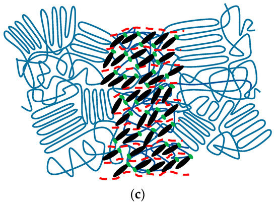 Figure 11 demonstrates the schematics of the self-assembled structures formed by Azo and PEG through hydrogen-bonding interaction. In the neat Azo, the van der Waals interaction between mesogens acted as a driving force, resulting in side-by-side and head-to-head packed mesogens. However, the van der Waals interaction resulted only in a short-range order of mesogens, forming a poorly ordered lamellar structure, as seen in Figure 11a. When PEG was complexed with Azo, the hydrogen-bonding interaction improved the regularity of the complex, promoting the self-assembly of the constituents into a well-ordered lamellar morphology composed of PEG-rich and Azo-rich microphases. This microphase-separated lamellar morphology resembles the supramolecular materials formed by a homopolymer and a small molecule with hydrogen bonds [51]. By contrast, mesogens confined in the Azo-rich microphases organized into a lamellar structure, producing lamellae containing Azo within lamellar phase morphology (Figure 11b). Because of the two independent series of diffraction peaks in SAXS patterns, the normals of the two different length-scale lamellae were not aligned in the same direction. The confinement of mesogens in the Azo-rich microphases facilitated the aggregation of mesogens, resulting in increased quantities of H-aggregated and J-aggregated mesogens. Furthermore, when PEG was crystallized, the lamellar phase morphology of the complex did not change, indicating that PEG crystallization occurred within hard confinement (Figure 11c). The hard confinement hampered the formation of chain-folded crystals, causing decreases in the crystallization temperature and degree of crystallinity. Consequently, PEG crystallization was prohibited when the PEG content was 50%.