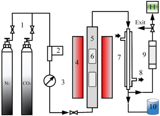 Schematic diagram of pyrolysis device formatting. 1: Gas supply unit, 2: Mass flow controller, 3: Pessure gauge, 4: Tube furnace, 5: Quartz tube, 6: Quartz boat, 7: Condensation tube, 8: Freezing fluid, 9: Quicklime dryer, 10: Liquid collector, 11: Gas-sampling bag.