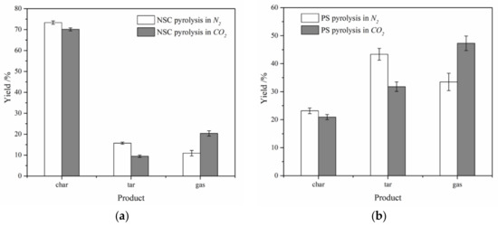 Yield distribution under N2 atmosphere and CO2 atmosphere: (a) NSC, (b) PS.