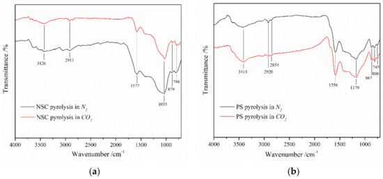 FT-IR of the char under N2 atmosphere and CO2 atmosphere: (a) NSC, (b) PS.