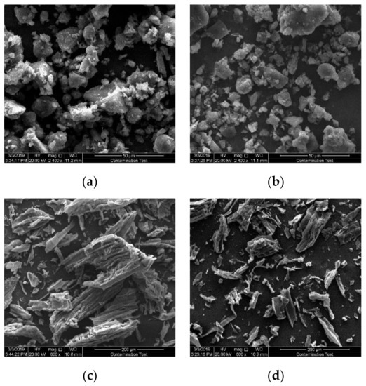 Apparently, the morphological structure of solid products obtained from pyrolysis of biomass samples under N2 and CO2 atmosphere differs and the SEM pictures of char generated from pyrolysis of PS are exhibited in Figure 4. In Figure 4c, the fibrous structure of biochar under N2 atmosphere is noticeable, while porous cavities are also visible from the images of morphology. Additionally, the fibers begin to break, and the fragments are numerous and disorderly, which is perhaps the result of fast release of condensable substance during rapid pyrolysis [32]. For the biochar generated in CO2, the pictures in Figure 4d indicate an important difference in its morphological structure, which exhibits more broken and sharper vascular bundles and a great deal of fines, which can be ascribed to the reaction of carbon and carbon dioxide. Biochar generated from pyrolysis of PS in CO2 evolves into abundant small structures, which indicates that the morphology makes a great difference when the surrounding gas is CO2. The observation proves the impact of CO2 on char surface more directly and obviously comparing with the pyrolysis of NSC.