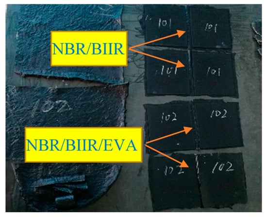 - NBR/BIIR and NBR/BIIR/EVA blends: The NBR, BIIR and EVA masterbatch was mixed in the corresponding proportions (the specific proportions of the blends are shown in Section 4.1 and Section 4.2) in a certain order (i.e., for NBR/BIIR, first BIIR, then NBR; for NBR/BIIR/EVA, first BIIR, then NBR, and finally EVA) on the two-roll mill at room temperature for 5 min. After 16 h, a rheometer analyzer was used to determine the scorch time T10 and the vulcanization time T90 of the mixture. These mixtures were then hot pressed and vulcanized at 150 °C under a pressure of 15 MPa for T90 to obtain cross-linked NBR/BIIR and NBR/BIIR/EVA samples (Figure 2).