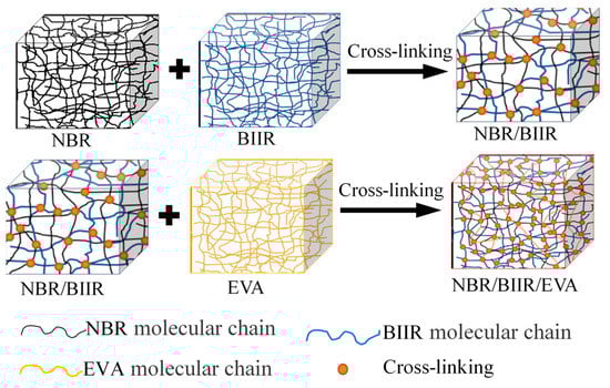 NBR/BIIR was prepared by blending strongly polar NBR with weakly polar BIIR base rubber. EVA copolymer was added to NBR/BIIR to promote the compatibility between NBR and BIIR phases and to further improve the overall performance of NBR/BIIR blends. The basis blending and cross-linking mechanism are shown in Figure 4.