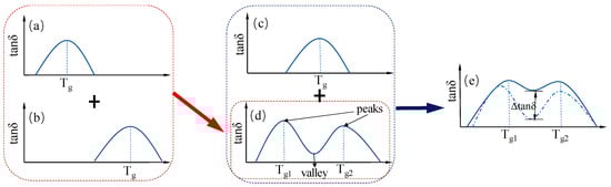 Variation of dynamic mechanical analysis (DMA) temperature spectrum of blends with miscibility of component polymers; (a–c) are the DMA temperature spectrum of the component high polymer, respectively; in (d,e), the miscibility increases sequentially.