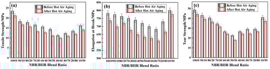 Comparison of mechanical properties before and after aging of NBR/BIIR with various blend ratios: (a) Tensile strength; (b) elongation at break, and (c) tear strength.