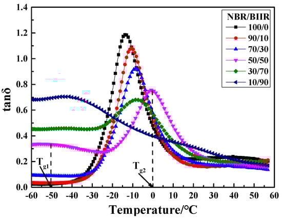 The storage modulus E′-T curves of NBR/BIIR are shown in Figure 9. The E′-T curves of both NBR/BIIR and pure NBR exhibit a transition peak. As the BIIR content increased, the storage modulus decreased significantly in the glassy region. When the BIIR content exceeded 50, the storage modulus tended to stabilize. This result shows that BIIR has a softening plasticizer effect on the NBR base rubber, making the NBR/BIIR blend softer and thus increasing the energy dissipation and improving the damping properties of the blend system.