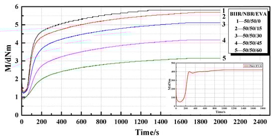 The vulcanization curves of NBR/BIIR (50/50) after adding the EVA copolymer are shown in Figure 12 and Table 5.