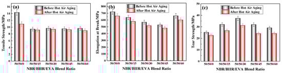 Comparison of mechanical properties before and after aging of NBR/BIIR/EVA with various blend ratios: (a) Tensile strength; (b) elongation at break, and (c) tear strength.