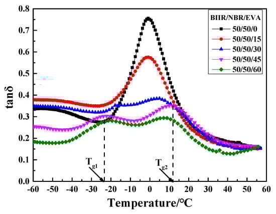 Further tests on the effect of the EVA copolymer on the dynamic mechanical properties of the NBR/BIIR blends were performed. The tanδ-T curve and damping parameters of the NBR/BIIR/EVA blend with various blend ratios are shown in Figure 14 and Table 6, respectively.