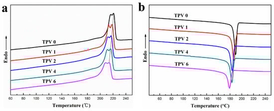 The crystallization and melting behaviors of TPV samples were measured using a differential scanning calorimeter (DSC, TA Q20, New Castle, DE, USA). Then, 3–5 mg samples were heated up to 250 °C rapidly under a nitrogen atmosphere and held at 250 °C for 5 min to eliminate the thermal history. Afterwards, the samples were cooled to 40 °C at a rate of 10 °C/min to record the crystallization behavior, and then heated again to 250 °C at a heating rate of 10 °C/min to record the melting behavior.