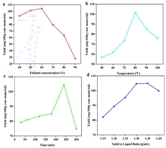Effect of ethanol concentration (a); temperature (b); time (c); and solid to liquid ratio (d) on the extraction yield of total flavonoids.