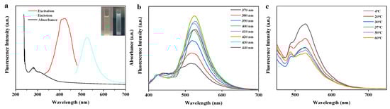 The optical properties of BRF. (a) Ultraviolet-visible (UV-vis) absorption, fluorescence excitation and emission spectra of BRF. Insert: images of the BRF observed under sunlight and UV light (365 nm), respectively; (b) fluorescence emission spectra of BRF with irradiation of various excitation wavelengths; (c) effect of temperature on the fluorescence intensity of BRF at the emission of 524 nm.