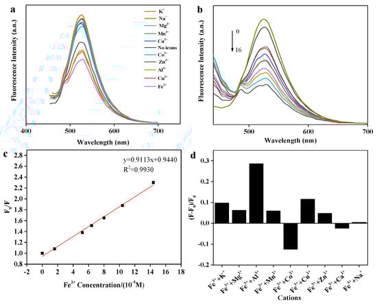 The strong binding affinity of oxygen-containing groups, such as hydroxyl and carbonyl groups on the surface of fluorescence sensor towards metal ions, which may result in remarkable changes of wavelengths and fluorescence intensity concerning emission spectra [37]. To analyze the selective fluorescence response behavior of BRF solution towards various metal ions, the emission spectra excited at 420 nm was detected, and the results are shown in Figure 3a. It can be seen that the fluorescence intensity varied with the addition of different metal ions (10 tested in total). The presence of some metal ions like Ca2+, Mn2+, Mg2+, Na+, and K+ contributed to the enhancement of fluorescence intensity, while other metal ions functionalized as fluorescence quencher. It has been reported that metal ions can coordinate with both hydroxyl groups and carbonyl groups on flavonoids. Resultant coordination complex then change the conjugation strength of the flavonoids, resulting in charge transfer between flavonoids and metal ions during excitation. This phenomenon is referred to as intramolecular charge transfer (ICT), which is responsible for either fluorescence quenching or enhancement [38]. Moreover, under the same conditions, a noticeable quenching behavior of Fe3+ to fluorescence intensity was observed compared to other metal ions, which alludes to higher thermodynamic affinity between Fe3+ ion and oxygen-containing groups of flavonoids [39]. This occurrence demonstrates that the BRF solution is highly selective over Fe3+ than other metal ions when analyzed using fluorescence methods.