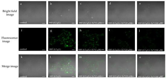 Considering the excellent fluorescence sensing of Fe3+ and biocompatibility of BRF, the bioimaging application of BRF for Fe3+ detection was investigated in living cells of liver cell L02 cells, which play important role in detoxification, metabolic regulation and energy storage. As shown in Figure 5, viable and intact cell morphology can be observed from the bright field and merge images, indicating the good biocompatible performance of BRF in L02 cells. Figure 5f,g showed the L02 cells did not emit fluorescence while cells with BRF incubation showed strong green fluorescence in the same condition, indicating the good cell membrane permeability property of BRF. In Figure 5h–j, it can be seen that the green fluorescence intensity of cell was decreased when it was incubated with the increased concentrations of Fe3+, indicating the efficient fluorescence quenching behavior of Fe3+ towards BRF in vitro. It can be concluded that the ICT detection system is capable of detecting Fe3+ in L02 cells, indicating the ability of BRF probe for Fe3+ detection in the biological system.