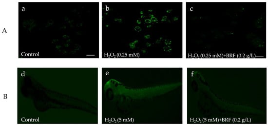 The antioxidant effect of BRF on H2O2-induced reactive oxygen species (ROS) production in zebrafish embryos. (A) L02 cell under fluorescence microscope; (B) zebrafish embryo under fluorescence microscope.