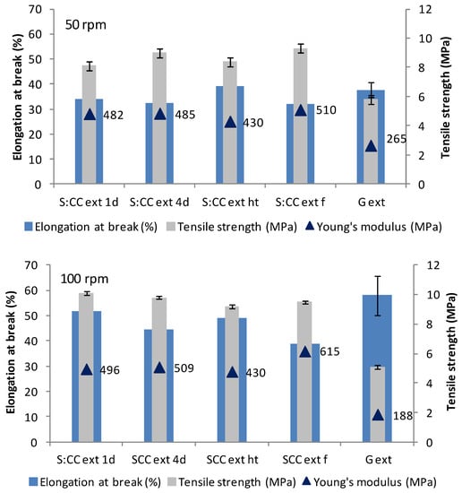 Selected systems with the best mechanical properties, i.e., starch with S:CC 2:1 and starch with G for comparison, were processed via extrusion. Influence of the premixtures pretreatment and two rotational speeds of the processing on the final thermocompressed films properties was investigated. Mechanical tests results are presented in Figure 3.