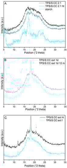 There are no significant differences between XRD patterns for films prepared using various methods of the premixture treatment before extrusion. However, for preheated and freshly extruded samples, some visible peak at 17.1° and for TPS/S:CC ht barely visible at 20.7° can be observed (Figure 4C). During preheating, starch granules slightly swell (as DSC results show), and water molecules from starch moisture can migrate or being trapped in swollen polysaccharide helices, affecting some changes in complex structure reflected on XRD patterns.