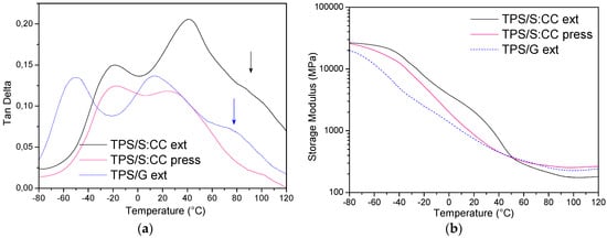 Storage modulus (E’) values (Figure 5b) at 25 °C for extruded TPS/S:CC, TPS/G, and thermocompressed TPS/SCC are 1661, 647, and 721, respectively, and are correlated to TS values.