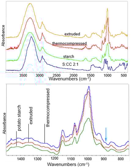 FTIR spectra for native granular starch, DES alone S:CC 2:1, and two TPS/S:CC 2:1 films prepared via different processing methods are shown in Figure 6. Comparing starch and TPS/DES, there are some characteristic bands maxima shifts (SM, Table S2). A broad band with high intensity in the range 3600–3000 cm−1 is assigned to complex stretching free, inter-, and intramolecular hydroxyl groups []. For TPS/S:CC, there is a shift of peak maximum to lower wavenumber values (towards DES peak maximum). The shift is greater for extruded material than for those that are thermocompressed only (SM, Table S2). A band at range 3000–2800 cm−1 came from stretching C–H groups and, for TPS/DES, is a visible doublet evidencing DES presence. An extra subtle peak at 2853 cm−1 exhibited slightly higher absorbance for thermocompressed film than for that preliminary extruded. This one, and the greater shift of OH peak, can be related to better mixing of starch and plasticizer and their stronger interactions for extruded TPS/S:CC. Starch and TPS peaks in fingerprint range 1200–900 cm−1 related to stretching C–O and C–C, as well as bending C–O–H groups from anhydroglucose units, can be seen []. Here, a slight shift, but towards higher wavenumber values, was also observed (SM, Table S2), indicating interactions weakening of external OH starch chains and forming new ones with plasticizer. Moreover, intensity of this region is higher for both TPS films than for native granular starch. The higher intensity of short-range region, especially the 1022 cm−1 peak, was the more amorphous starch []. These results correspond with XRD data. Interestingly, films, especially for that based on preliminary extruded material, can be seen with uncovered peak at 891 cm−1. In the literature, there is a scarce discussion or explanation about its origin. According to [], it can be assigned to ß-glucosidic linkages that are absent in starch or to C–Cl groups; however, in our work, this peak was also observed for TPS plasticized with other S-based DES (e.g., S:G 1:2), which do not contain chloride in their structure (data not shown).