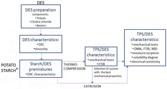 The aim of this preliminary study was to investigate changes in starch/DES compositions to further conform of TPS processing parameters. Additionally, the analysis helped to partially explain why extra pretreatment facilitates thermocompression molding.