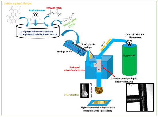 Schematic representation showing the T-shaped microfluidic junction processing of an alginate-based porous film formation from bubble bursting used in this experimental work.
